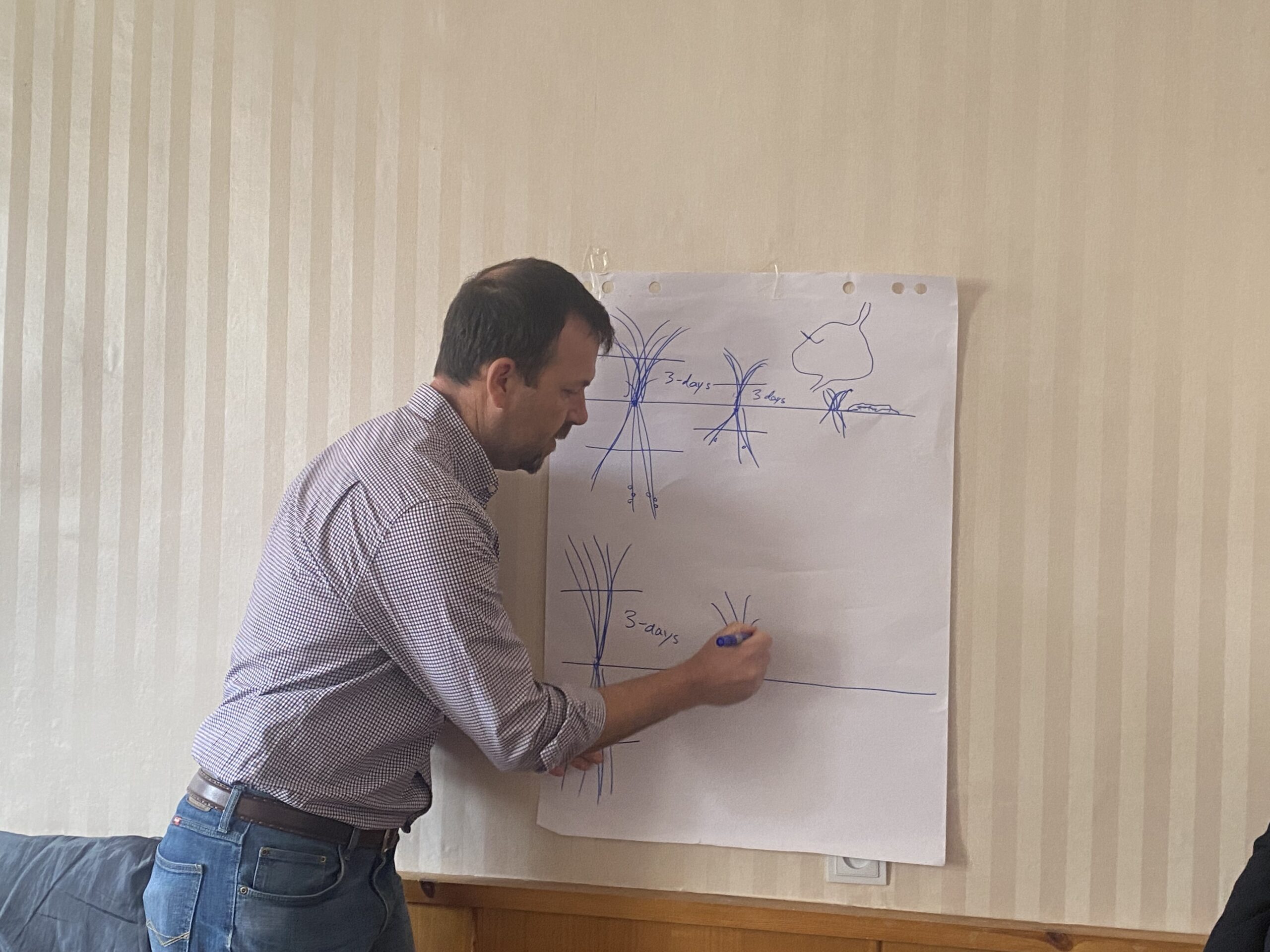 The international expert provided on-job (hands-on) training for local beneficiaries in conducting grazing capacity analyses and planning the grazing applications for the first year of pasturelands restoration measures implementation. In particular, Nicholas Sharpe provided an in-depth explanation of how to use the Annual Grazing Planning sheet for pilot areas of village pastures and, following the first year of grazing plan implementation, how to adapt management practices to overall productivity objectives. The expert showcased the importance of gathering field data, assessing and monitoring pastureland conditions over the grazing period, developing a Grazing Objectives Sheet and carrying out Grazing Days calculations for the development of grazing calendars for each pilot pasture in the villages of Naniani, Ganakhleba and Sno; Appropriate recommendations were also provided to the local farmers to ensure the effective implementation and sustainability of restoration measures on the pilot pastures in the target villages.