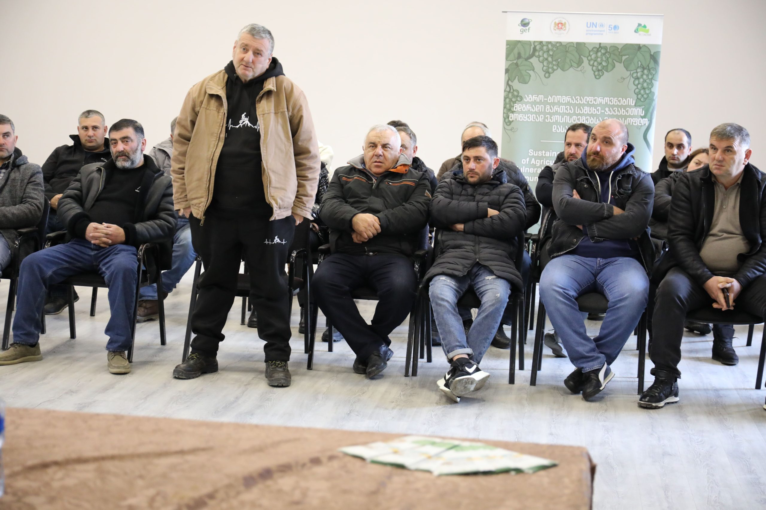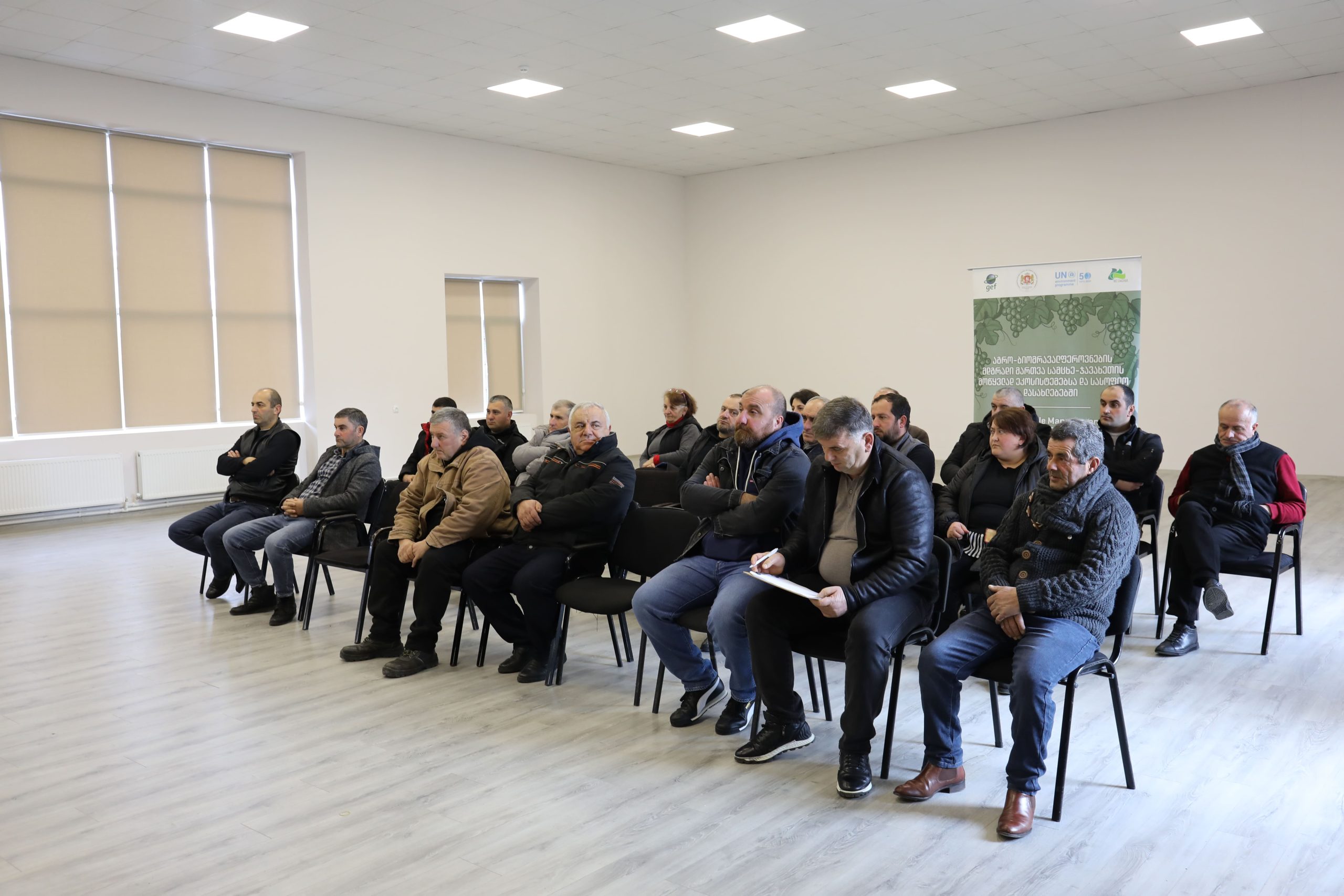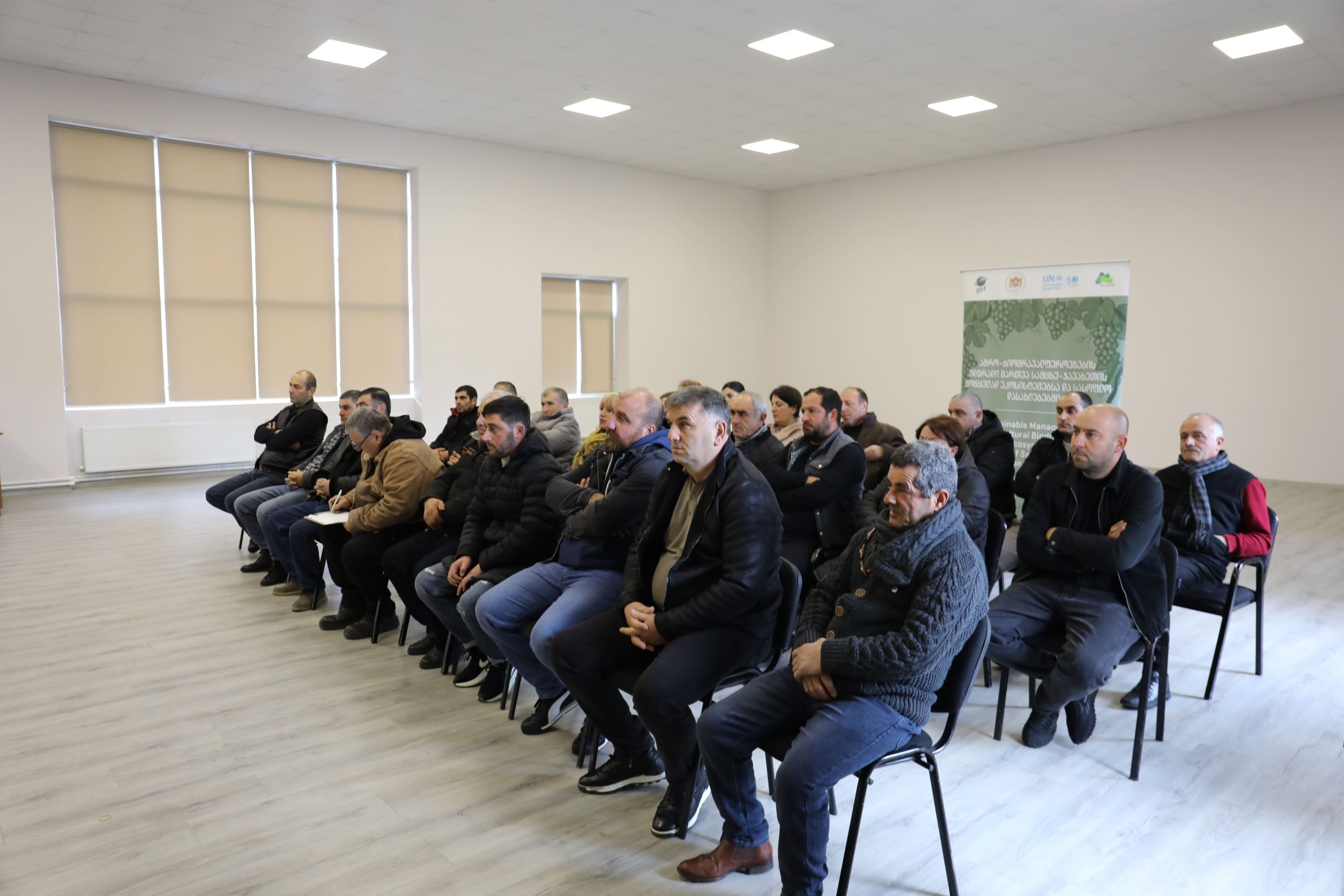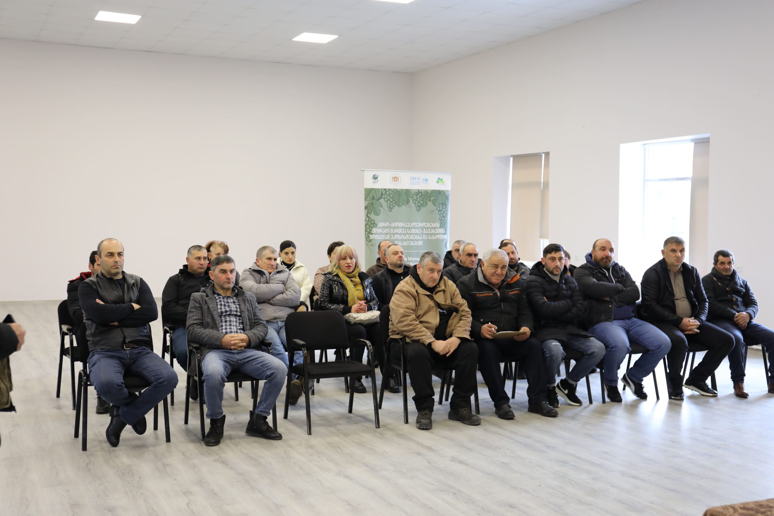 The training program was the result of collaboration with the Scientific-Research Center of Agriculture (SRCA) and was led by Levan Ujmajuridze, a viticulture expert. The event was attended by 54 farmers and interested participants from Aspindza, Adigeni, and Akhaltsikhe municipalities, held in the settlement of Aspindza and the city of Akhaltsikhe. Topics covered included soil fertility, grapevine seedling and soil preparation techniques, vine cultivation and treatment measures from early spring to late autumn, and the care of vines during cold winter months.